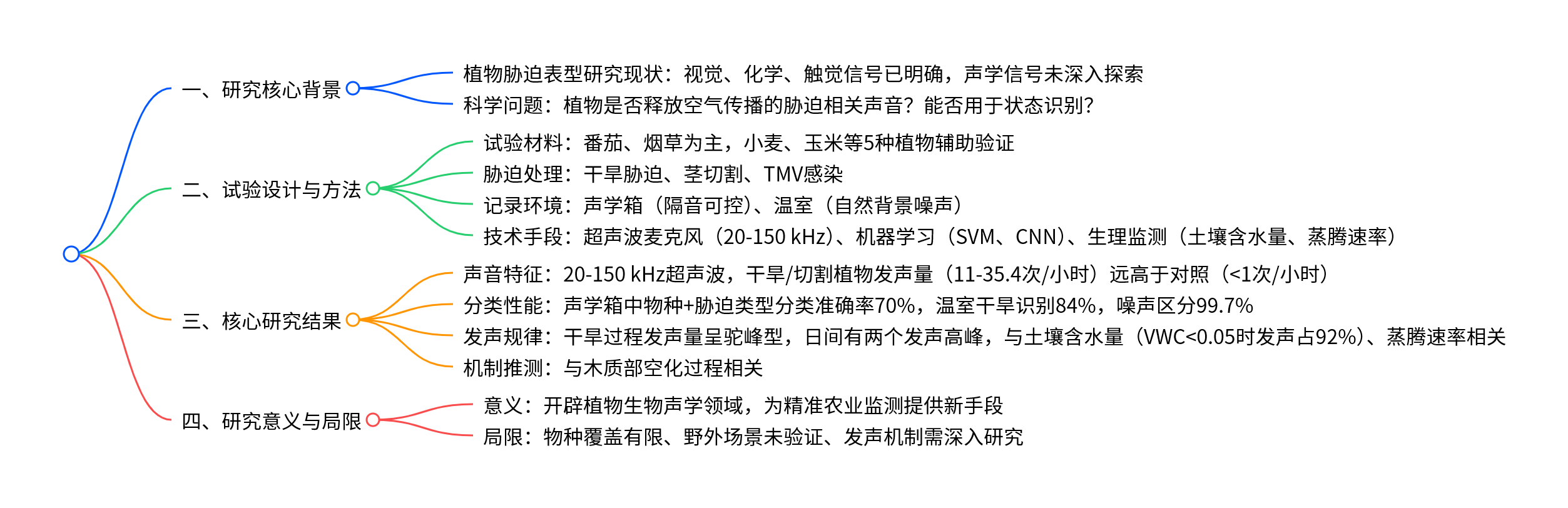 该研究发表于 2023 年《Cell》,首次证实受胁迫的植物会释放可远程检测的超声波空气传播声音,番茄、烟草等植物在干旱、切割等胁迫下,会发出 20-150 kHz 的超声波,且声音具有物种特异性和胁迫类型特异性;通过支持向量机(SVM)、卷积神经网络(CNN)等机器学习模型,可基于这些声音实现 70%-99.7% 的胁迫类型、物种及干旱程度分类,在温室环境中区分干旱与正常植物的准确率达 84%,其发声机制可能与木质部空化相关,为农业植物监测、生态信号传递研究开辟了新方向。