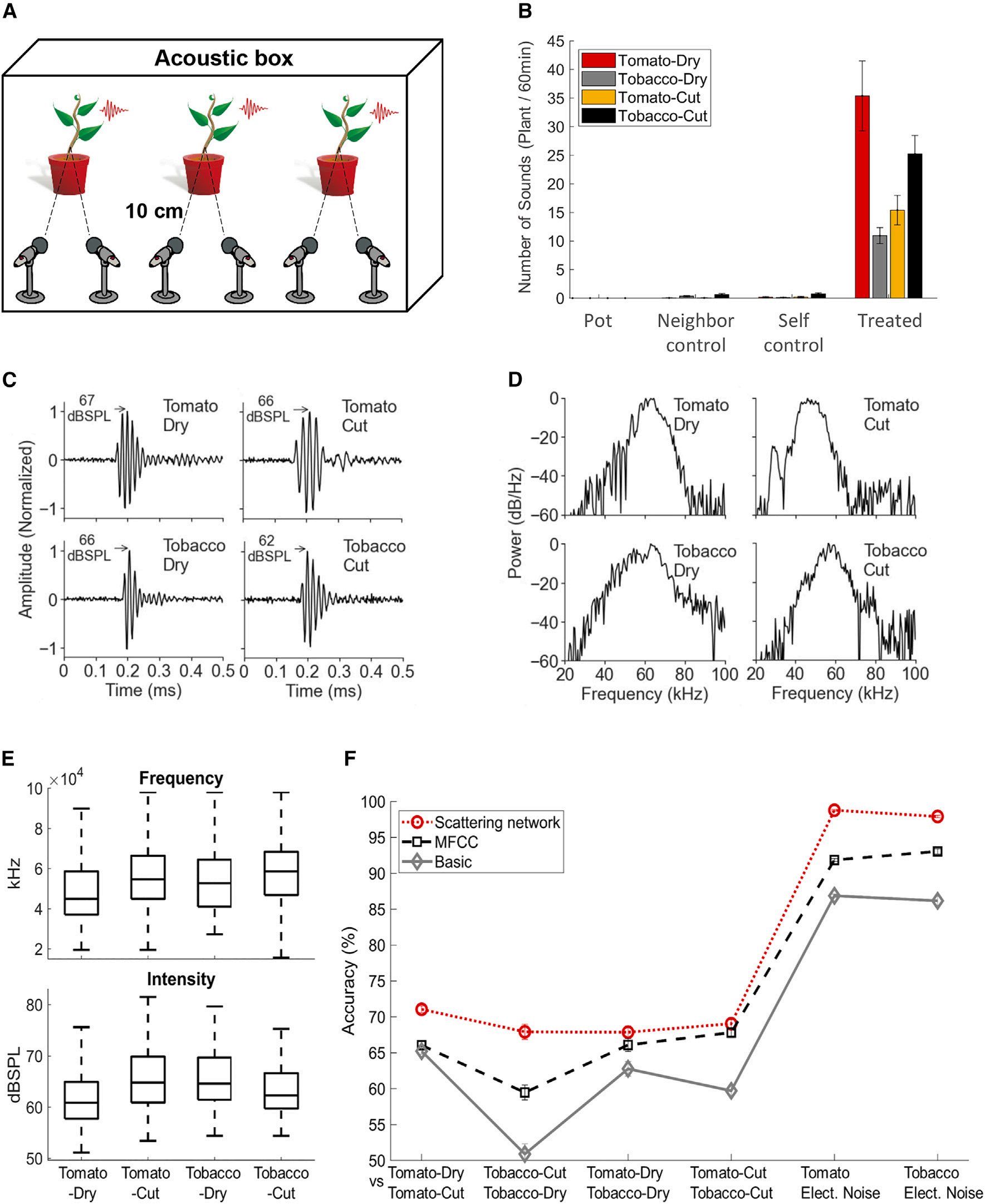 受胁迫植物会释放可远程检测的超声波信号,这些信号可揭示植物状态及物种特征。(A)声学箱装置设置。每次记录时,将三株植物置于50×3×100×3×150 cm³的声学箱内,并在每株植物两侧各安装一个指向性麦克风。采用双麦克风设计有助于消除记录系统电噪声及植株间干扰导致的误检现象。(B)番茄与烟草植株在两种处理条件下(干旱胁迫与剪切处理)1小时记录期间发出的平均声音数量。设置三个对照组:盆栽对照组(含土壤但无植株)、自控组(处理前植株状态)及邻近对照组(与处理植株共用声学箱的未处理植株)。所有处理组声音发射量均显著高于所有对照组(p < 10⁻⁶,经Bonferroni校正的Wilcoxon检验):自控组与邻近对照组所有植株-处理组合的检测频率均低于1次/小时;各组检测频率为19%±51次/株,盆栽对照组(>500小时记录)未检测到声音信号。误差线表示标准误。(C)不同处理条件下声音时间信号示例:干旱胁迫番茄、干旱胁迫烟草、剪切番茄及剪切烟草的归一化处理结果。箭头标注10cm处峰值dBSPL值(以20mPa为基准)(详见STAR方法部分)。